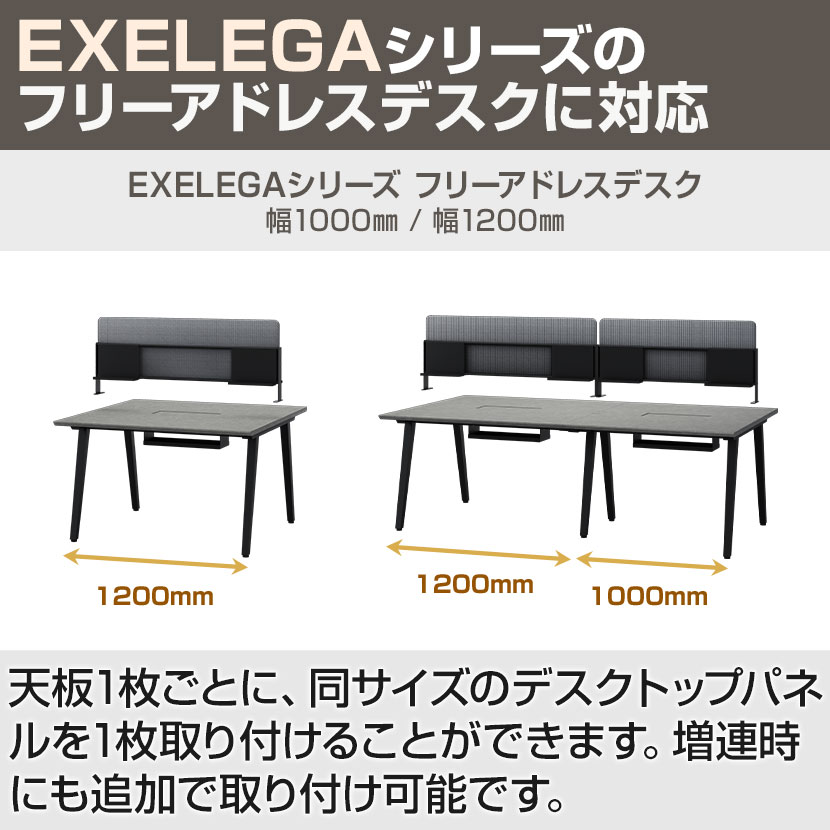 EXELEGAフリーアドレスデスクの天板1枚ごとに、同サイズのデスクトップパネルを1枚取り付けることができます。増連時にも追加で取り付けができるので、人数が増えても柔軟な対応が可能です。※ミーティングテーブルには取り付けできません。