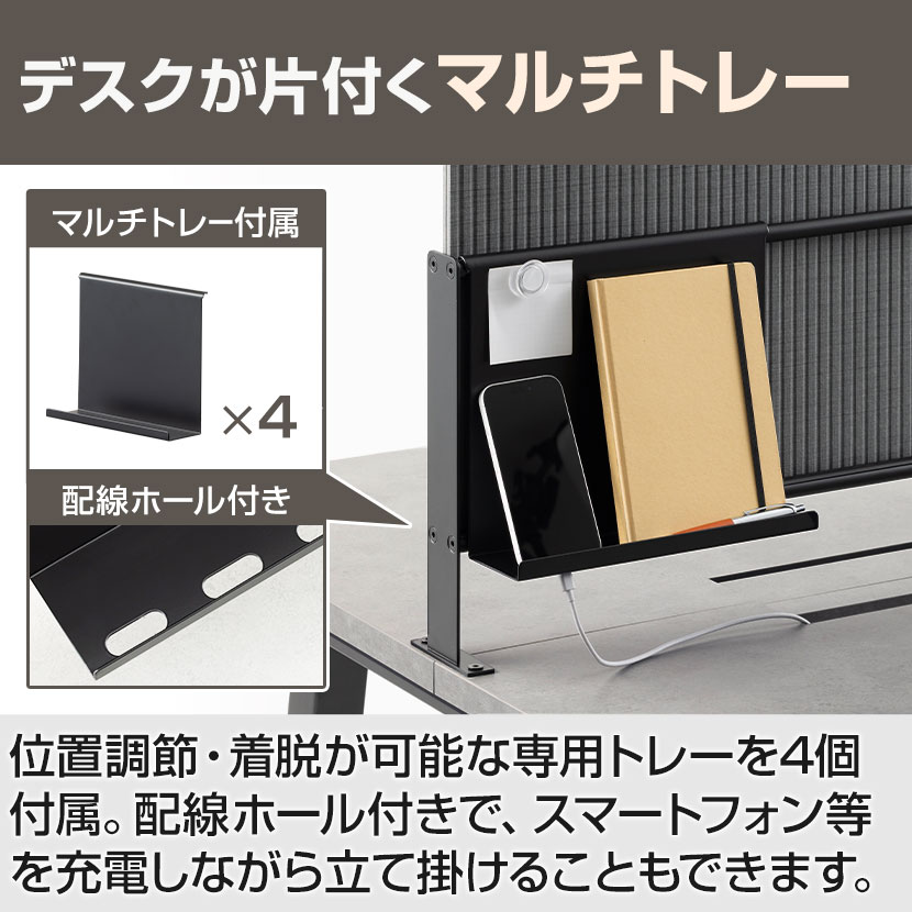 位置調節・着脱が可能な専用トレーを4個付属。ケーブル用の配線ホール付きで、スマートフォン等を充電しながら立て掛けることもできます。