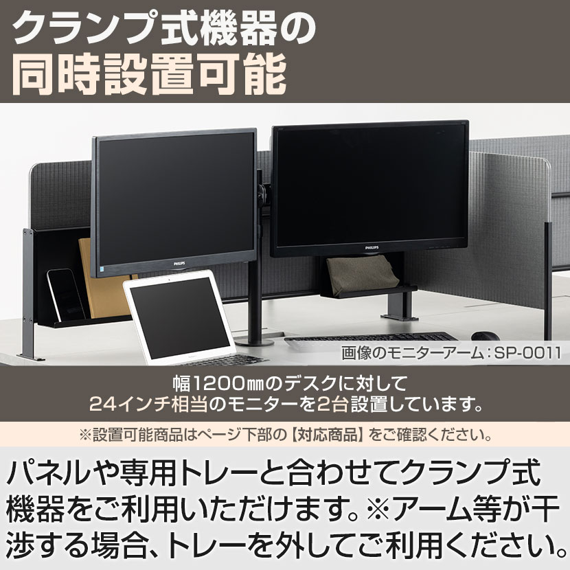 クランプ式機器の取り付け時も、パネルや専用トレーと合わせてご利用いただけます。 ※アーム等が干渉する場合、トレーを外してご利用ください。