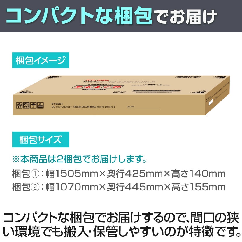 コンパクトに梱包してお届けするので、間口の狭い環境でも搬入しやすく、スペースが限られた場所でも保管しやすいのが特徴です。