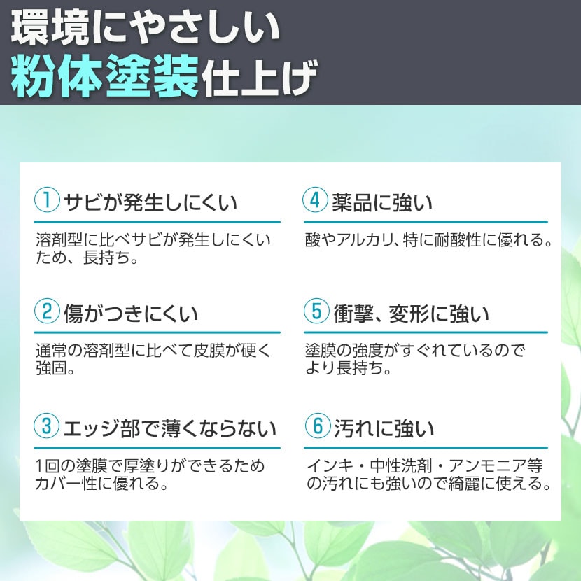 耐久性に優れた粉体塗装仕上げ。サビや汚れに強く、指紋も目立ちにくいため、お手入れが簡単です。