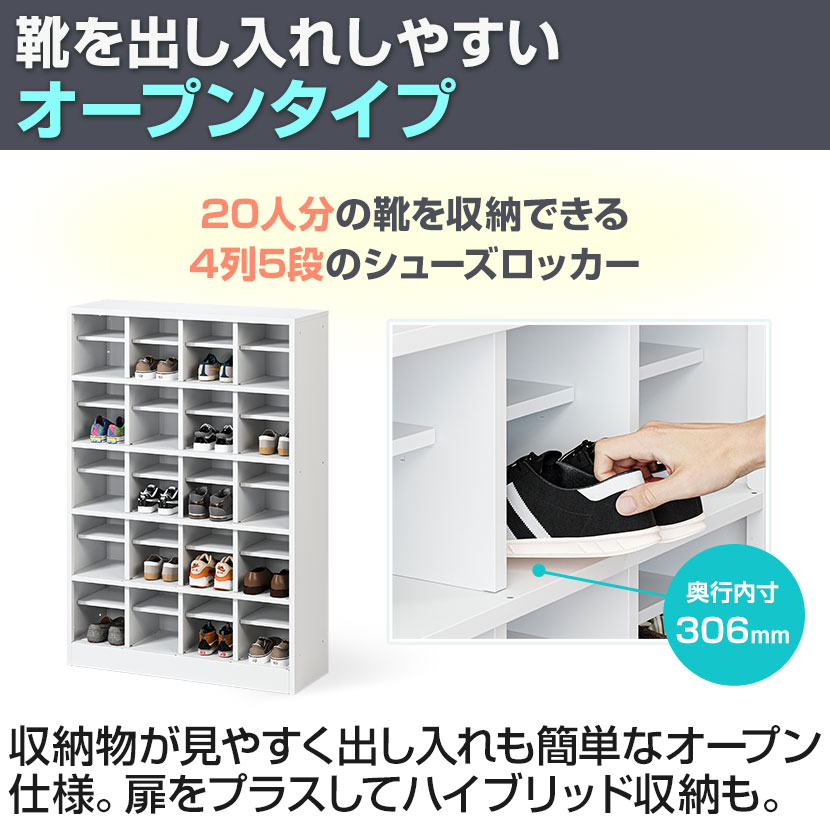 上履きと外履きなどを上下の棚で分けて収納可能。清潔さを保ちたい場所での使用にも配慮しています。