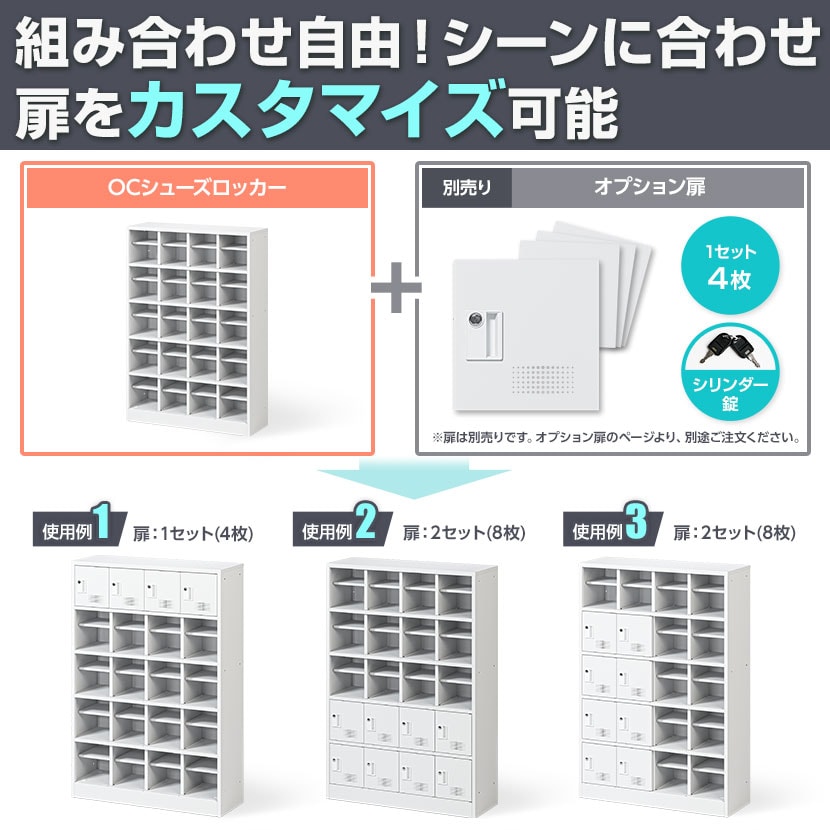 収納物が見やすく出し入れも簡単なオープン仕様。用途に合わせ、カギ付きの扉を簡単に追加できます。