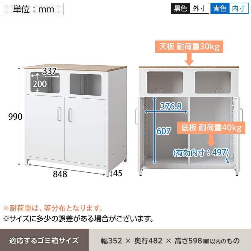 内部には70Lクラスの大型ゴミ箱を2個並べて設置可能。オフィスのゴミ収集量にも余裕をもって対応できる、十分な容量を確保しています。