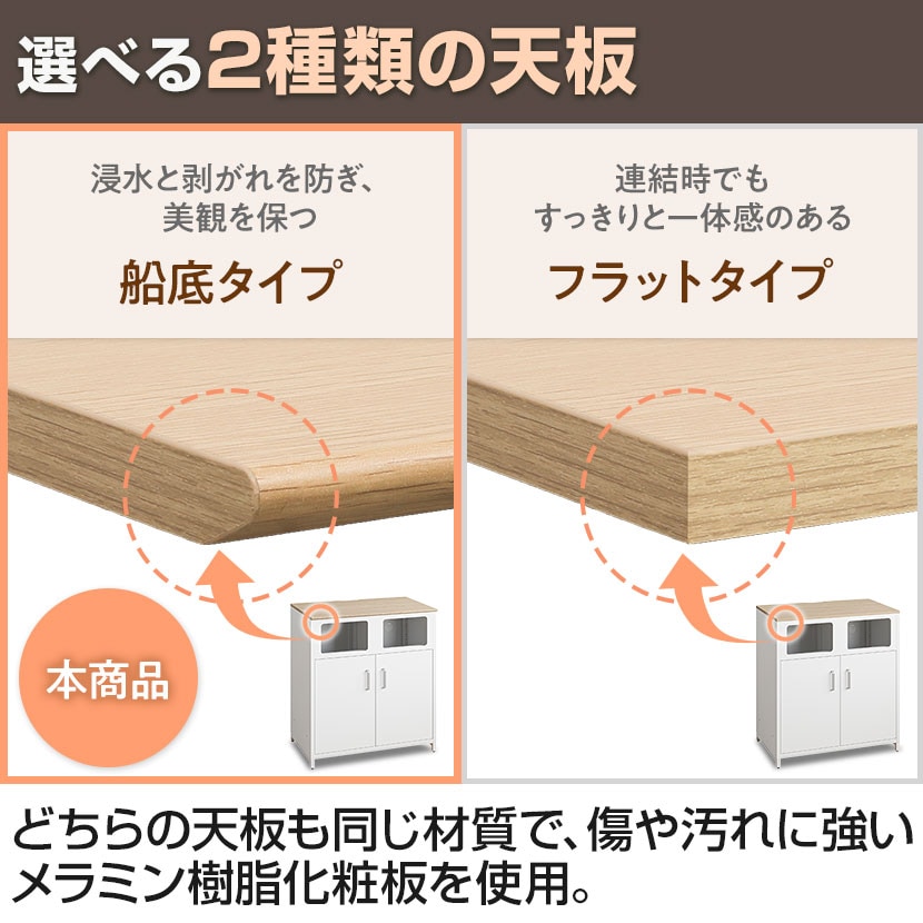 コーヒーマシンをスマートに設置できるこだわりの設計。選べる2種類の天板に加え、同シリーズの「開き戸」「オープン」タイプと連結可能です。