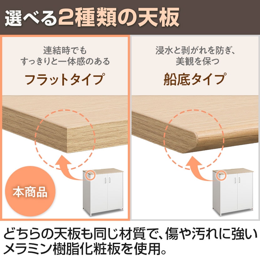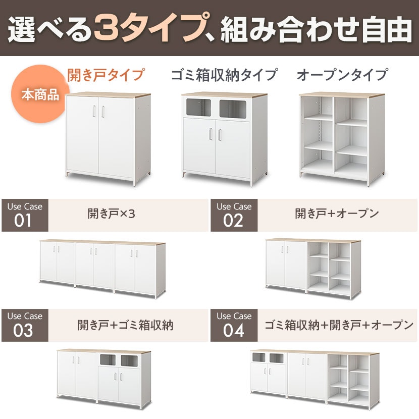 コーヒーマシンをスマートに設置できるこだわりの設計。選べる2種類の天板に加え、同シリーズの「ゴミ箱収納」「オープン」タイプと連結可能です。