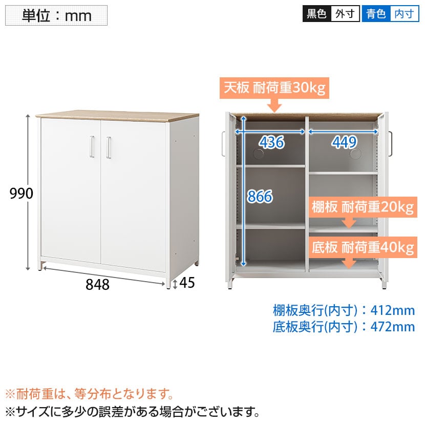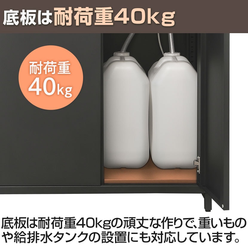 底板は耐荷重40kgの頑丈な作りで、重いものもまとめてしっかり収納できます。給排水タンクの設置にも対応しています。