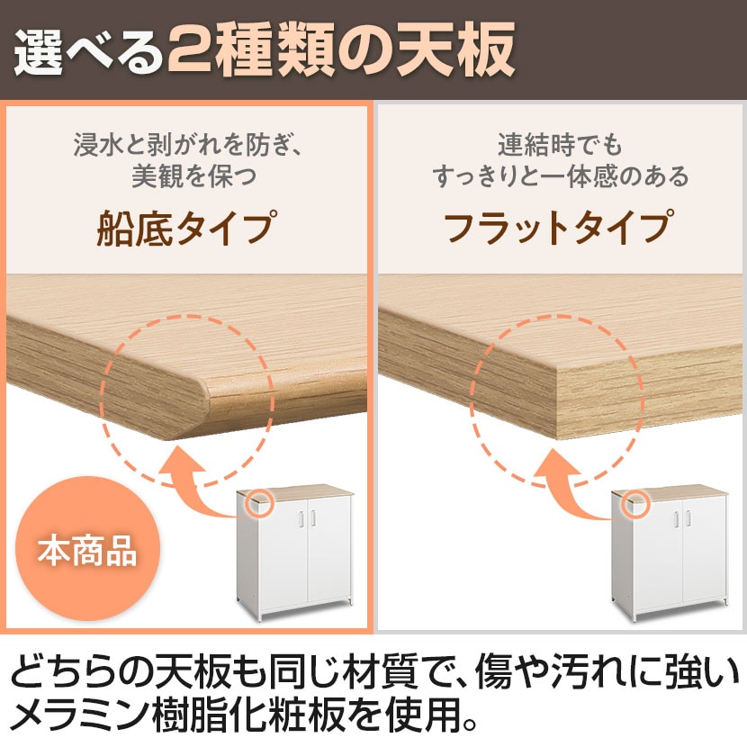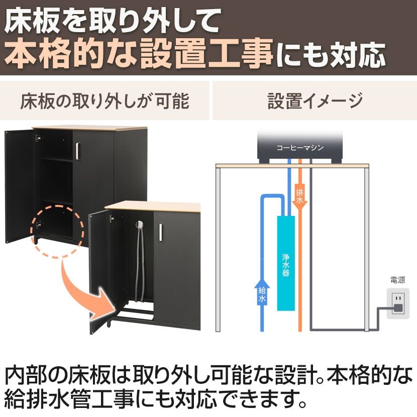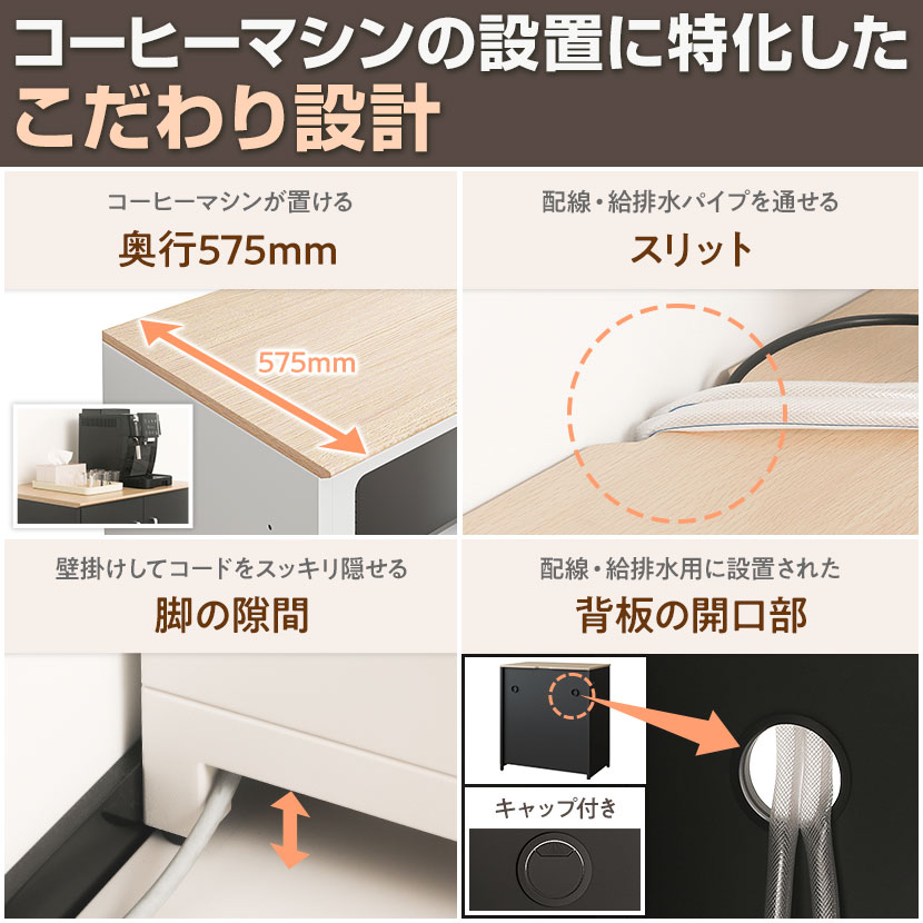 コーヒーマシンをスマートに設置できるこだわりの設計。選べる2種類の天板に加え、同シリーズの「ゴミ箱収納」「オープン」タイプと連結可能です。
