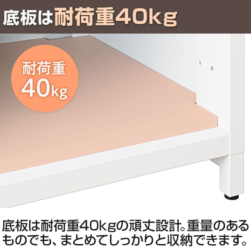 底板は耐荷重40kgの頑丈設計。重量のあるものでも、まとめてしっかりと収納することができます。