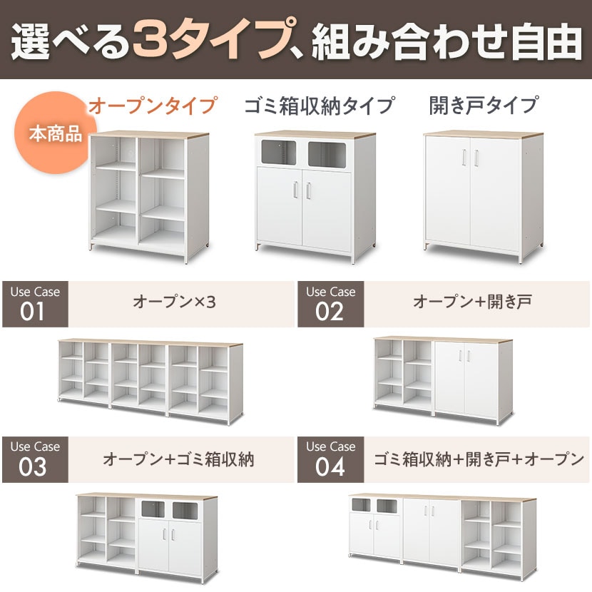 コーヒーマシンをスマートに設置できるこだわりの設計。選べる2種類の天板に加え、同シリーズの「ゴミ箱収納」「開き戸」タイプと連結可能です。