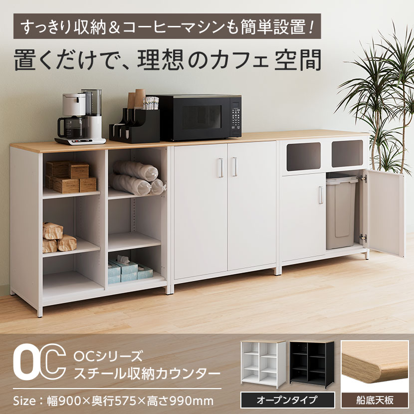 雑多に見えがちなオフィスの一角を、美しく機能的なカフェコーナーに。OCシリーズスチール収納カウンター(オープンタイプ/船底天板)は、備品をすっきりと収納しながら、コーヒーマシンも設置可能。面倒な配線や給排水もスマートに整理でき、理想のリフレッシュスペースを手軽に実現します。