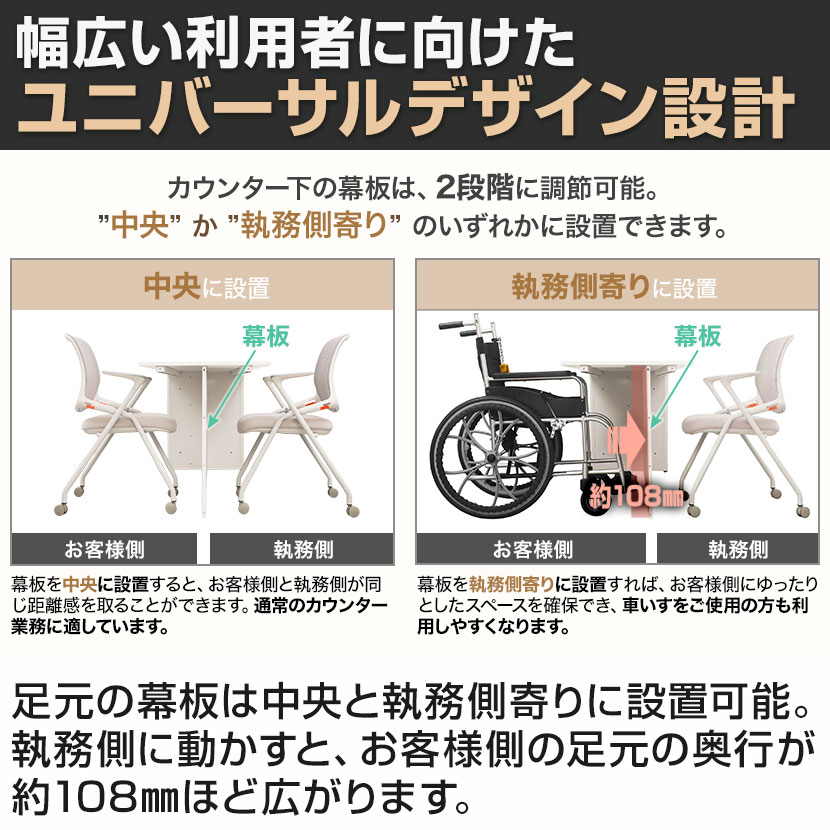 足元の奥行は、幅広い利用者を想定して設計されました。足元の幕板は中央または執務側寄りに設置でき、執務側に動かすとお客様側の足元の奥行が約108mm広がります。人にやさしいユニバーサルデザインで、オフィスや店舗はもちろん、公共機関や病院、福祉施設にもおすすめです。