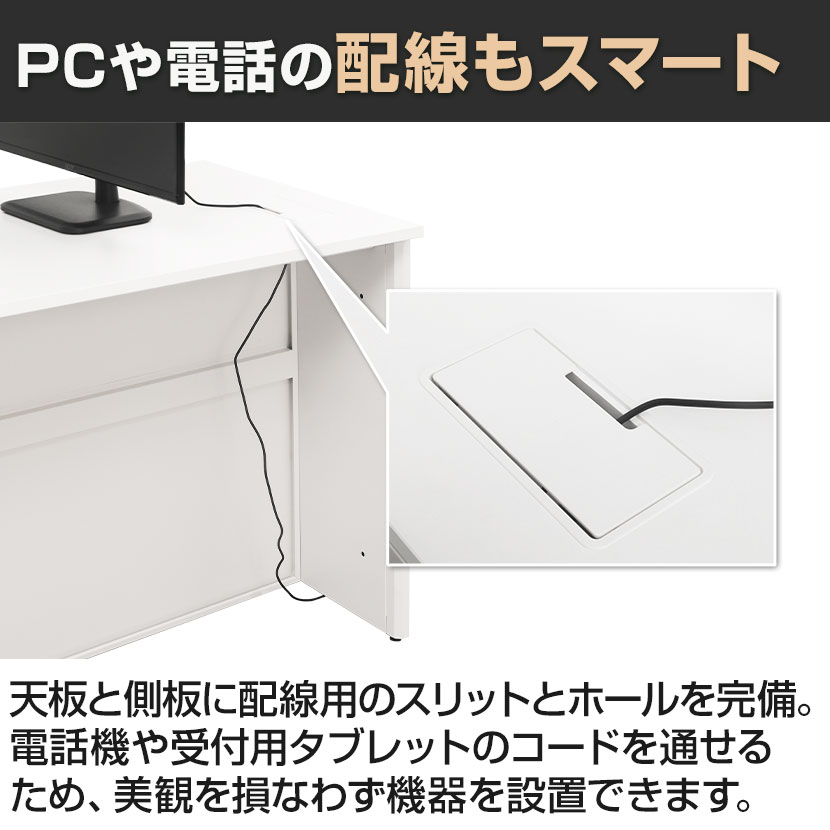 天板にタブレットや電話機の配線がすっきり収まる配線ホールを設置。オフィスや店舗の景観を損ねません。