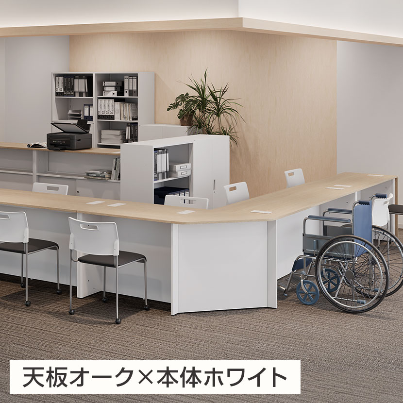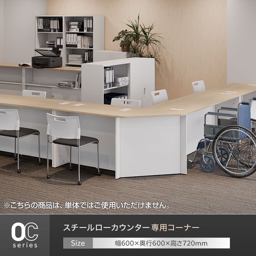 オフィスや店舗の窓口など、さまざまなシチュエーションの接客に対応できるOCシリーズ スチールカウンターのロータイプと連結してご使用いただける専用コーナーです。ローカウンターをこちらの専用コーナーで繋ぐことで、L字型のレイアウトが作れます。スチール製で耐久性に優れ、さらに粉体塗装を施しているので指紋などの汚れが目立ちにくく、日々のお手入れ負担を軽減します。