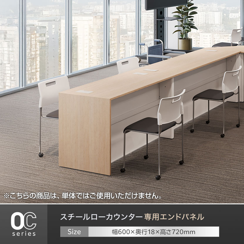 OCシリーズのローカウンターの側面に取り付けることができる専用エンドパネルです。取り付けるだけでデザイン性の高いカウンターに早変わり。パネルをビスで固定することで、カウンターを空間の間仕切りとして利用できます。カラーはホワイト、オーク、ウォルナットの3色展開で、インテリアテイストに合わせてお選びいただけます。
