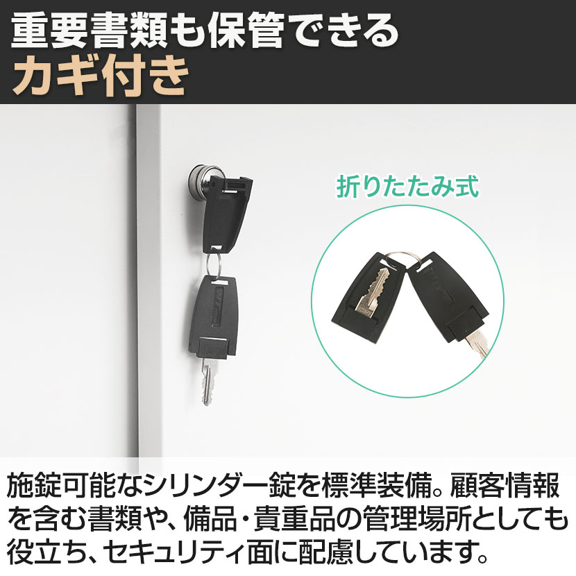 施錠可能なシリンダー錠を標準装備。顧客情報を含む書類や、備品・貴重品の管理場所としても役立ち、セキュリティ面に配慮しています。