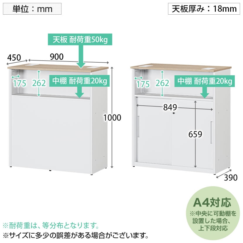 お客様側にはバッグなどのちょっとした手荷物が置ける中棚付き。持ち物や上着を一時的に置いたり、パンフレットなどの小物を置くのにも重宝します。執務側には、便利な中棚に加えて、スライド式の引き違い扉付き。 書類やA4ファイルがたっぷり収納でき、カウンター周りもすっきりします。