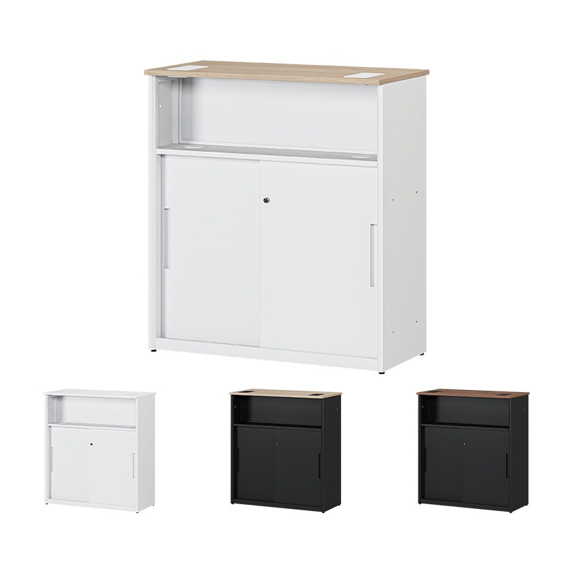 立ったままでの接客に丁度いい高さ1000mmのハイカウンターです。執務側には書類や備品を収納できる収納付き。カウンター周りをすっきり整理でき、通路の動線もスムーズに。スチール製で耐久性に優れ、さらに粉体塗装を施しているので指紋などの汚れが目立ちにくく、日々のお手入れ負担を軽減します。スタンダードなデザインと木目調を含む豊富な4色のラインナップで、公共施設から商業施設、オフィスまで様々な空間に馴染みます。