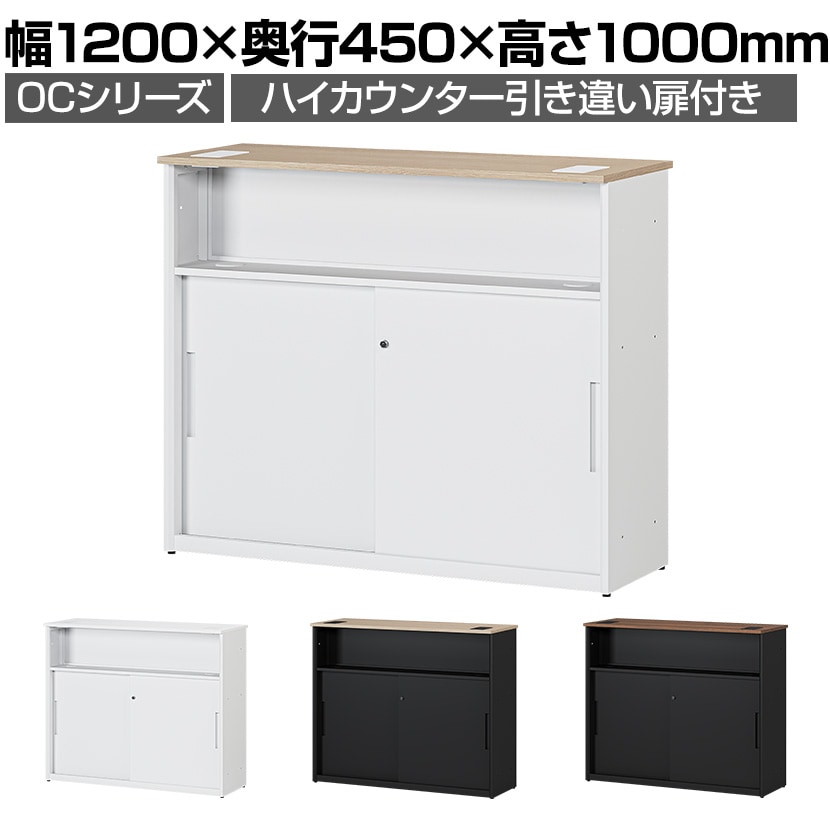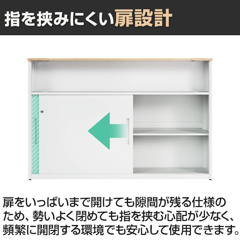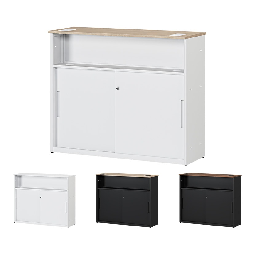 書類や備品をすっきり収納。引き違い扉付きスチール製ハイカウンター