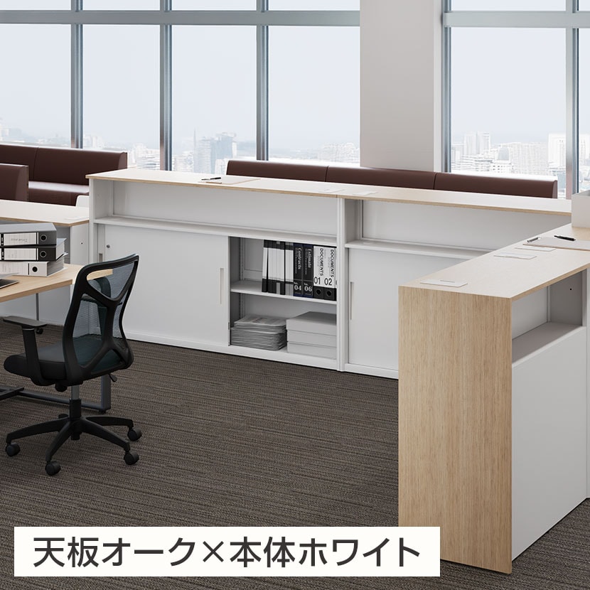 立ったままでの接客に丁度いい高さ1000mmのハイカウンターです。執務側には書類や備品を収納できる収納付き。カウンター周りをすっきり整理でき、通路の動線もスムーズに。スチール製で耐久性に優れ、さらに粉体塗装を施しているので指紋などの汚れが目立ちにくく、日々のお手入れ負担を軽減します。スタンダードなデザインと木目調を含む豊富な4色のラインナップで、公共施設から商業施設、オフィスまで様々な空間に馴染みます。