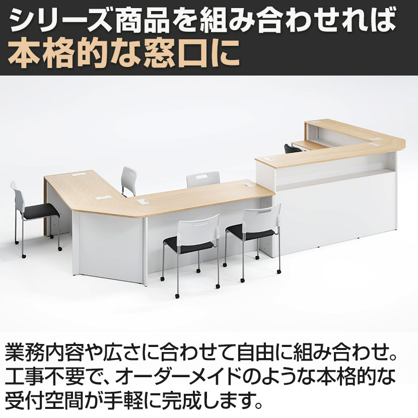 業務内容や広さに合わせて自由に組み合わせ。専用コーナーを間に挟むことで、L字型のレイアウトが構成できます。両側につければコの字型のレイアウトも可能です。工事不要で、オーダーメイドのような本格的な受付空間が手軽に完成します。