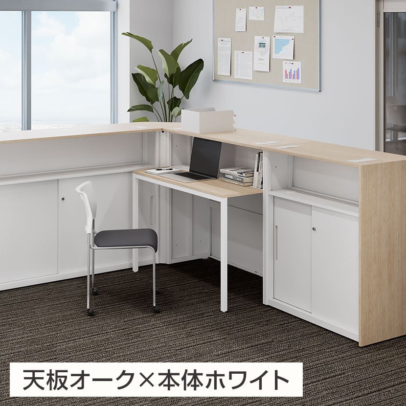 別売りのハイカウンター内側に固定して使用でき、天板高さは一般的な事務デスクと同じ720mm。座って事務作業をしながら、来客時には顔を上げるだけでスムーズに応対できます。PC画面や内部資料をお客様から見えにくい位置に置けるため、受付まわりのセキュリティ確保にも役立ちます。