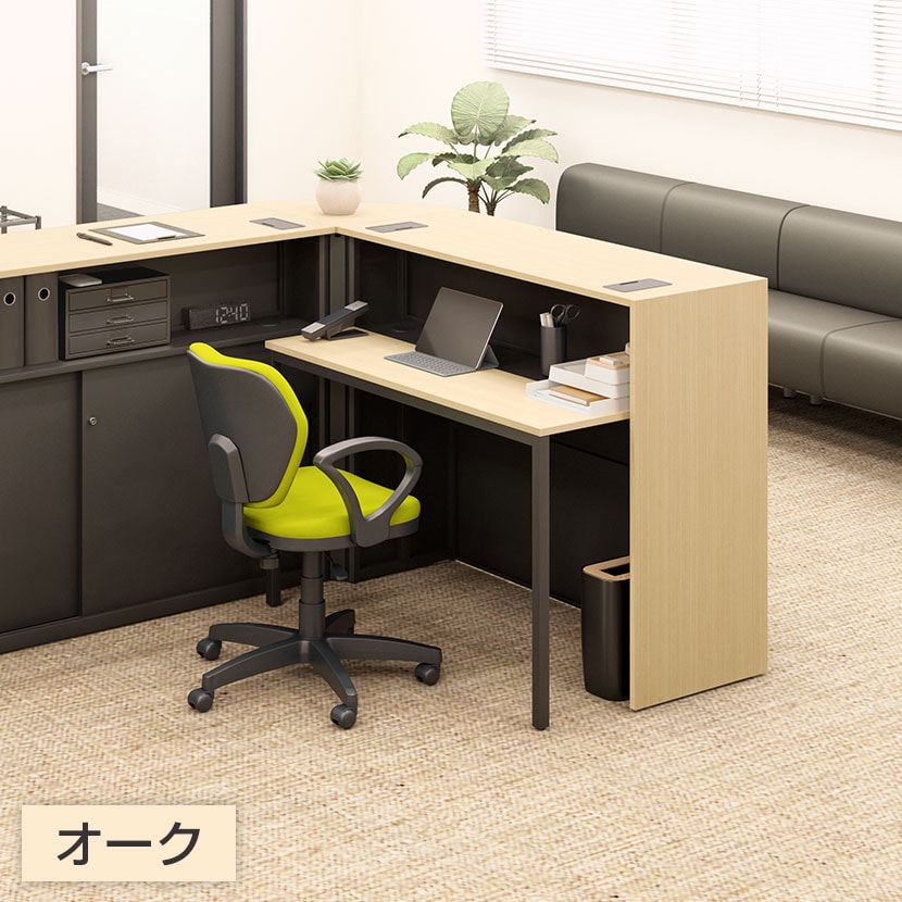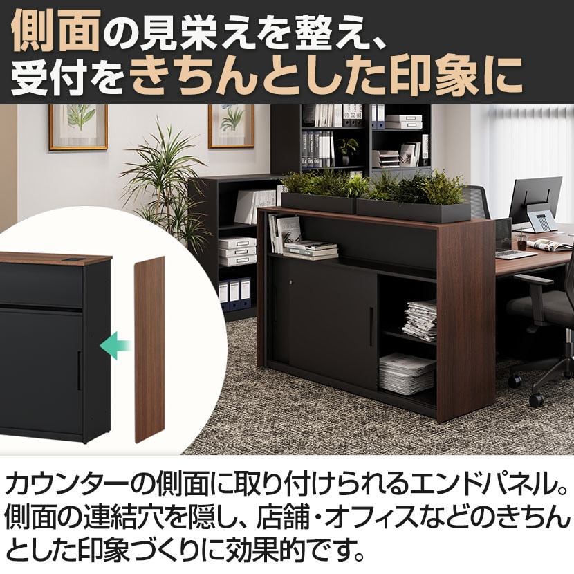 シンプルなカウンターが、エンドパネルを取り付けることでグレードアップ。側面の連結穴を隠し、店舗・オフィスなどで“きちんとした印象づくり”に効果的です。