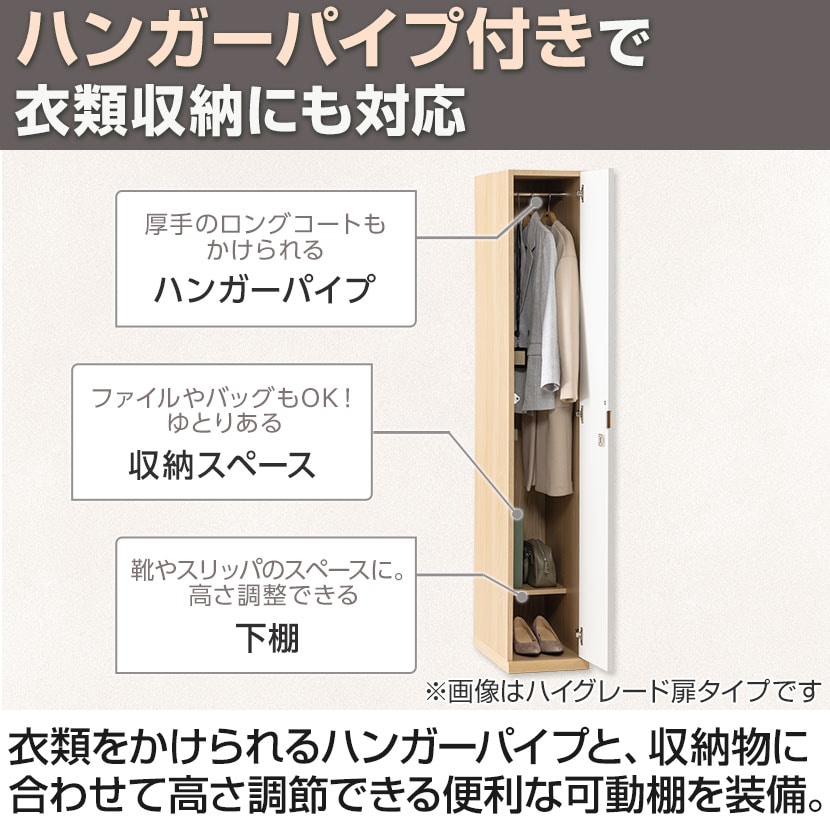 衣類や小物をかけられるハンガーパイプと、収納物に合わせて高さ調節できる便利な可動棚を装備。自由に空間を使い分けできます。