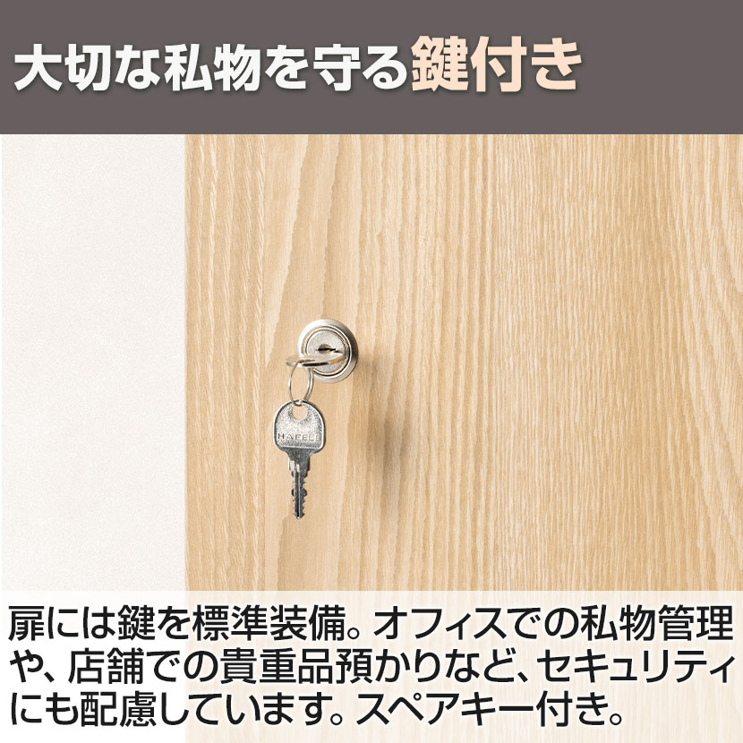 扉には鍵を標準装備。オフィスでの私物管理や、店舗での貴重品預かりなど、セキュリティにも配慮しています。スペアキー付き。