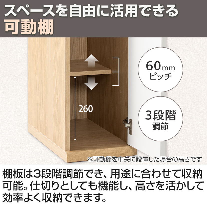 棚板は3段階調節でき、用途に合わせて収納可能。仕切りとしても機能し、高さを生かして効率よく収納できます。