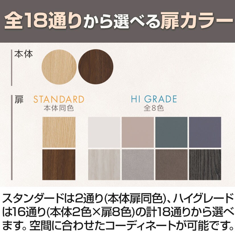 スタンダードは2通り(本体扉同色)、ハイグレードは16通り(本体2色×扉8色)の計18通りから選べます。空間に合わせたコーディネートが可能です。