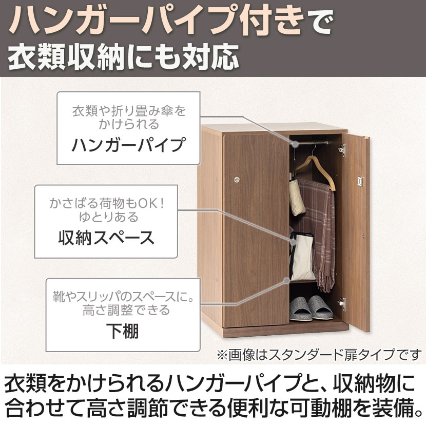 衣類や小物をかけられるハンガーパイプと、収納物に合わせて高さ調節できる便利な可動棚を装備。自由に空間を使い分けできます。