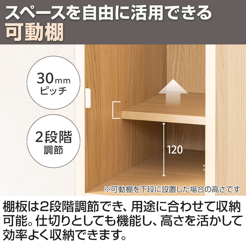 棚板は2段階調節でき、用途に合わせて収納可能。仕切りとしても機能し、高さを生かして効率よく収納できます。