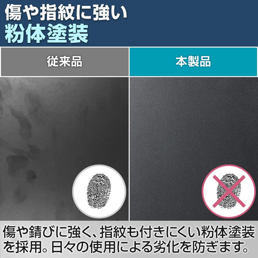 傷や錆びに強く、指紋も付きにくい粉体塗装を採用。日々の使用による劣化を防ぎ、長く美しくお使いいただけます。