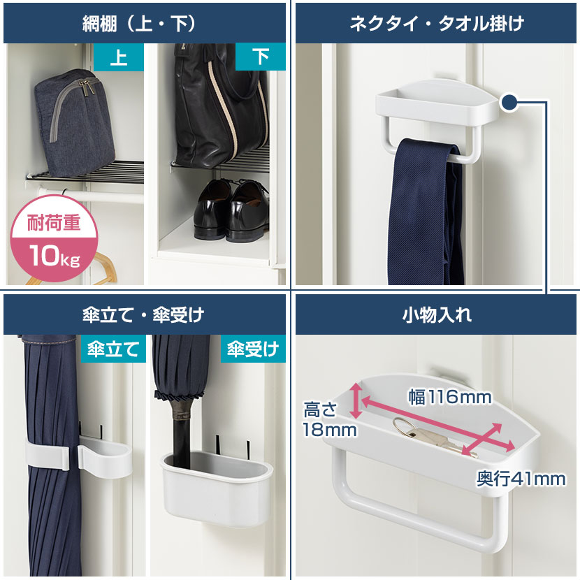 取り外し簡単なマグネット式ネームプレートをはじめ、小物入れやタオル掛けなど、細やかな配慮が行き届いた日本仕様の付属品を標準装備しています。