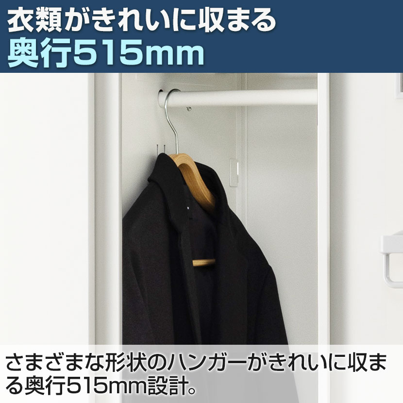 さまざまな形状のハンガーがきれいに収まる奥行515mm設計。スーツやコートもシワにならず、すっきりと収納可能です。