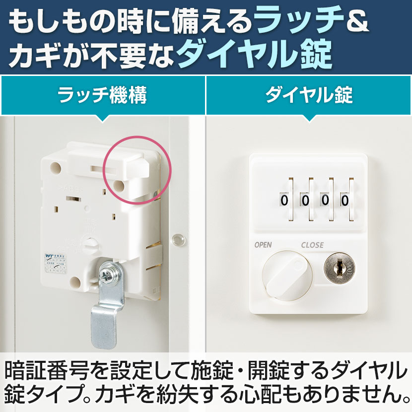 暗証番号を設定して施錠・開錠するダイヤル錠タイプ。カギを持ち歩く必要がなく、紛失する心配もありません。