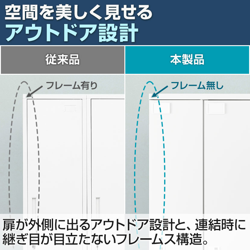 充実の機能と洗練されたデザイン、そして大手メーカーに引けを取らない確かな品質。コストを抑えつつも働く環境の質を向上させたいと考える、すべての企業や店舗様の想いをカタチにしたスチールロッカーです。使う人の満足度を高め、訪れる人にも好印象を与える空間づくりをサポートします。
