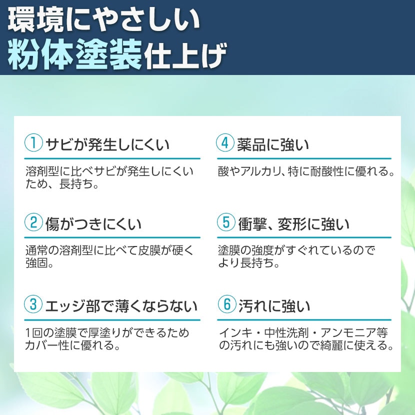 傷や錆びに強く、指紋も付きにくい粉体塗装を採用。日々の使用による劣化を防ぎ、長く美しくお使いいただけます。