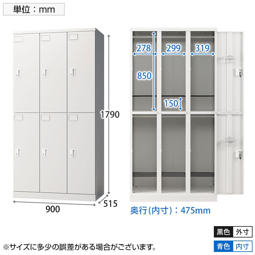 ロッカー有効内寸(中央) / 幅299×奥行475×高さ1690mm