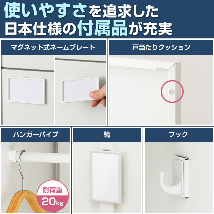 取り外し簡単なマグネット式ネームプレートをはじめ、小物入れやタオル掛けなど、細やかな配慮が行き届いた日本仕様の付属品を標準装備しています。