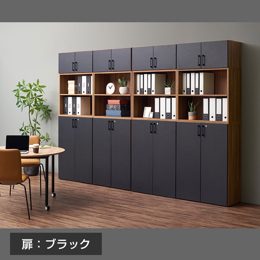 1~3段までのキャビネットを積み重ねて、最大6段の収納棚に!オープンと扉付きタイプをご用意しており、用途に合わせた組み合わせが可能です。積み重ねたキャビネットを横に並べれば、オフィス空間をデザインするコーディネートを展開できます(4段以上連結する場合は必ず壁面に設置してください)。