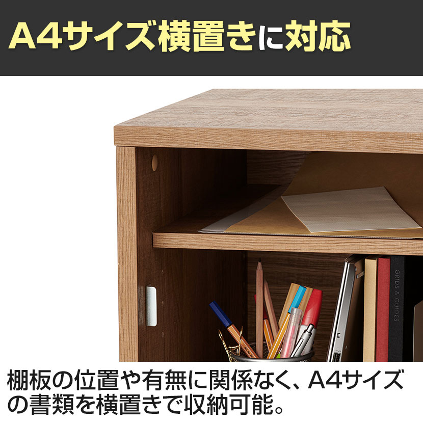 棚板の位置や有無に関係なく、A4サイズの書類を横置きで収納可能。扉を開けた時に、投函された書類も落下しにくい広さがあり、下段には私物を収納できます。