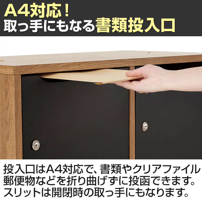 投入口はA4に対応し、書類やクリアファイル、郵便物などを折り曲げずに投函できます。また、投入口になっているスリットは、取っ手として活用できます。