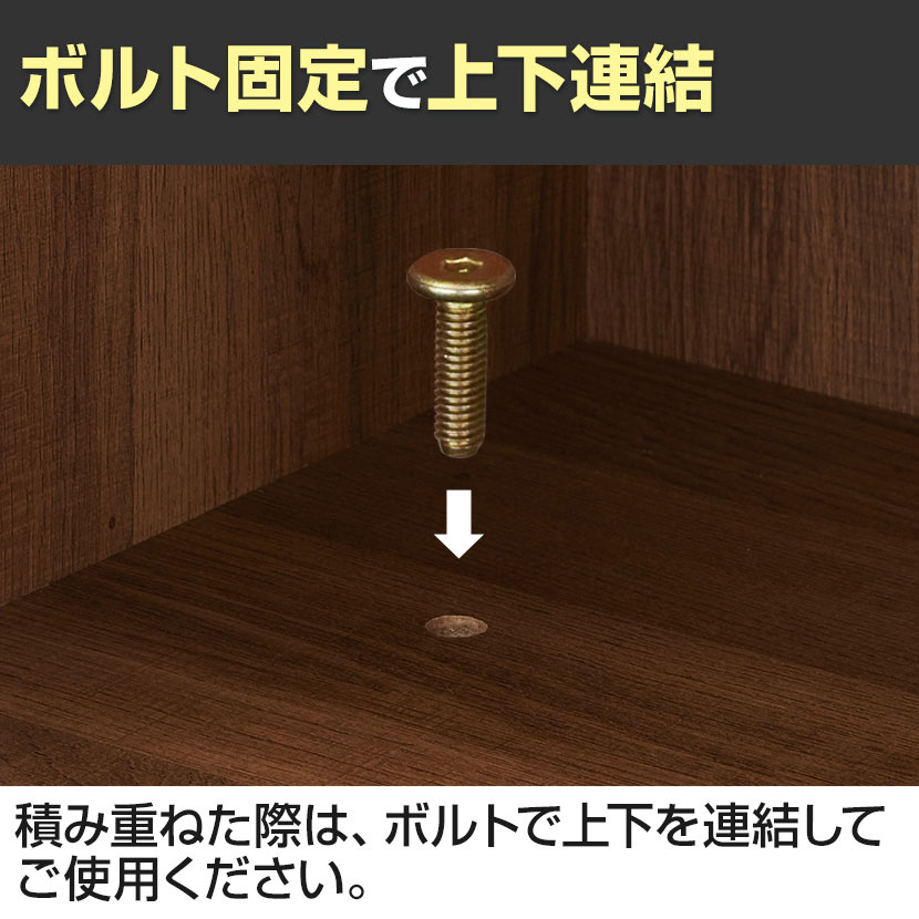 積み重ねた際は、ボルトで上下を連結してご使用ください。しっかり固定できるので、上置きキャビネットの安定性が向上します。