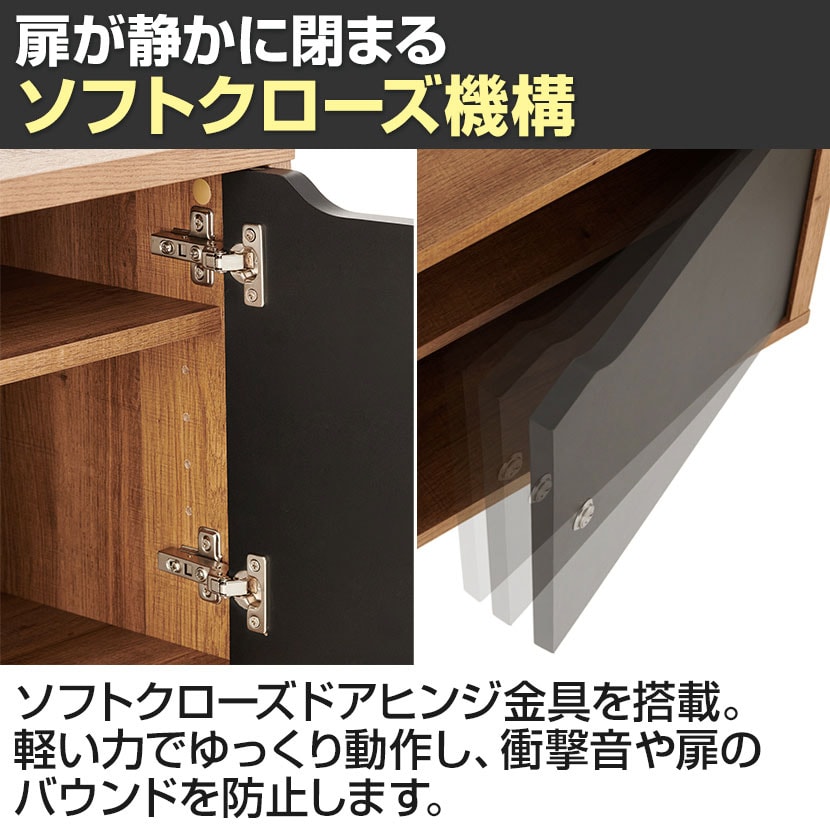 扉が静かにゆっくりと閉まるようアシストする金具、ソフトクローズドアヒンジを搭載。軽い力で動作し、衝撃音や扉のバウンドを防止します。枠を傷付けず、指をはさむ危険性も抑える、本体にも使用者にも配慮された機構です。