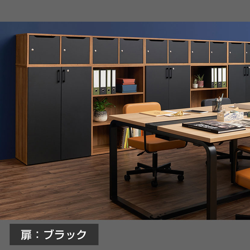 同シリーズのキャビネットを組み合わせられるので、共有収納スペースとパーソナルロッカーをミックスした大型壁面収納を実現! メンバーが自然に集まる収納空間をつくれます。1・2・3段を最大6段まで積み重ねられ、ロッカーは手の届きやすい1~5段までのレイアウトがおすすめです(4段以上連結する場合は必ず壁面に設置してください)。