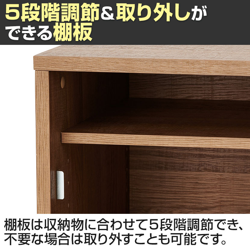 棚板の位置は、収納物に合わせて5段階調節可能。不要な場合は取り外すこともできるので、用途に沿った収納スペースの活用が可能です。