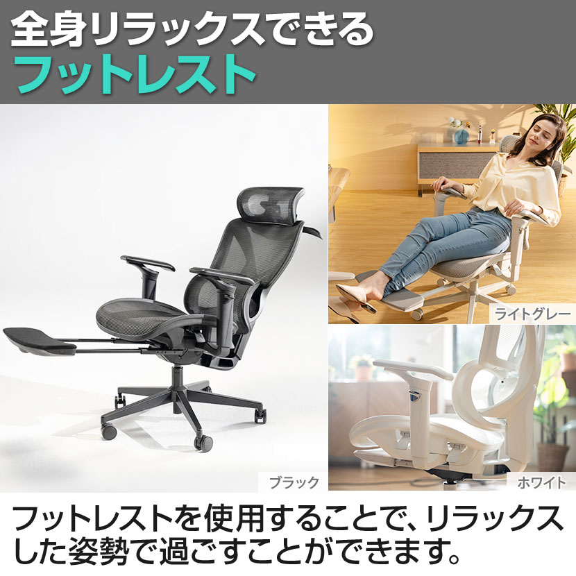 欲しい機能が詰まった、多機能ワークチェアCOFO(コフォ)。首・肩・腰のサポート力を徹底強化し、幅広い身長にフィットする設計に進化したPro2タイプです。フットレスト、3Dヘッドレスト、4段階ランバーサポート、215°アームレスト、127°リクライニング機能など、快適な作業環境をサポートする機能を数多く搭載。洗練されたフォルムでインテリアの雰囲気を損なわず「負担軽減 × 集中力を高める、至高の空間作り」を実現するデスクチェアです。