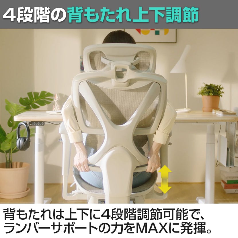 背もたれは上下に4段階調節可能で、ランバーサポートの力をMAXに発揮。腰部分はサポートを前後にスライドさせ、4段階の角度調節が可能。長時間座り続けても、常に快適な位置で力強く支え続けます。座面前後スライドの調節レバーは、座ったままさっと手が届く位置にあるので簡単に操作が可能。身体の大きな方から小柄な方まで心地の良いポジションを見つけられます。